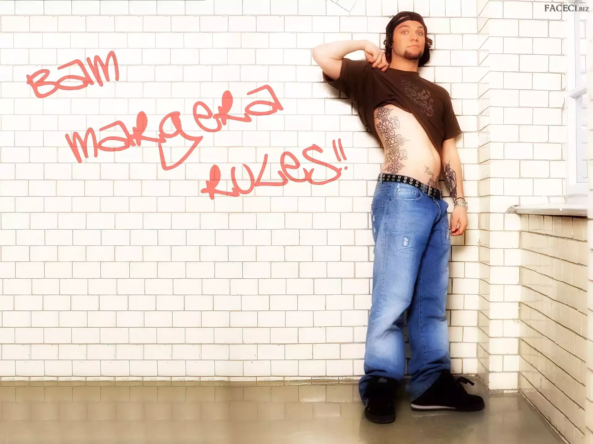 włosy, Bam Margera, ciemne okulary, Bam Margera, twarze t-shirt, Bam Margera, brązowy zegarek, Bam Margera, deskorolka okulary, Bam Margera, butelka kurtka, Bam Margera, rozpięta